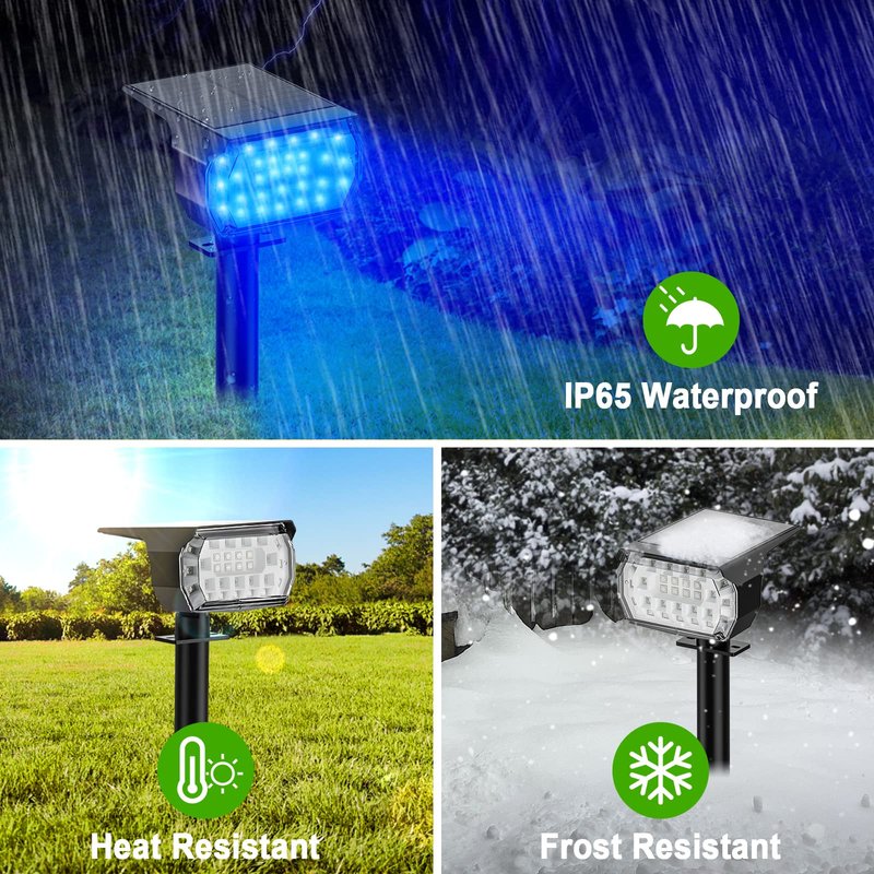 - 【Improved Brightness with 30 LEDs】: Equipped with 30 high-brightness LED beads, RGB color solar spotlights can last up to 8 hours after 6-8 hours full charged under direct sunlight. Designed with reflective structures, solar spotlights outdoor can reduce lighting loss and increase brightness. They light up on both sides and provide a larger wide illumination angle than others on the market.