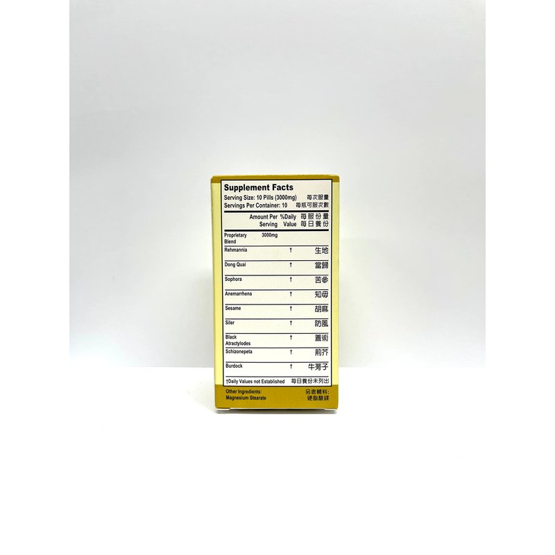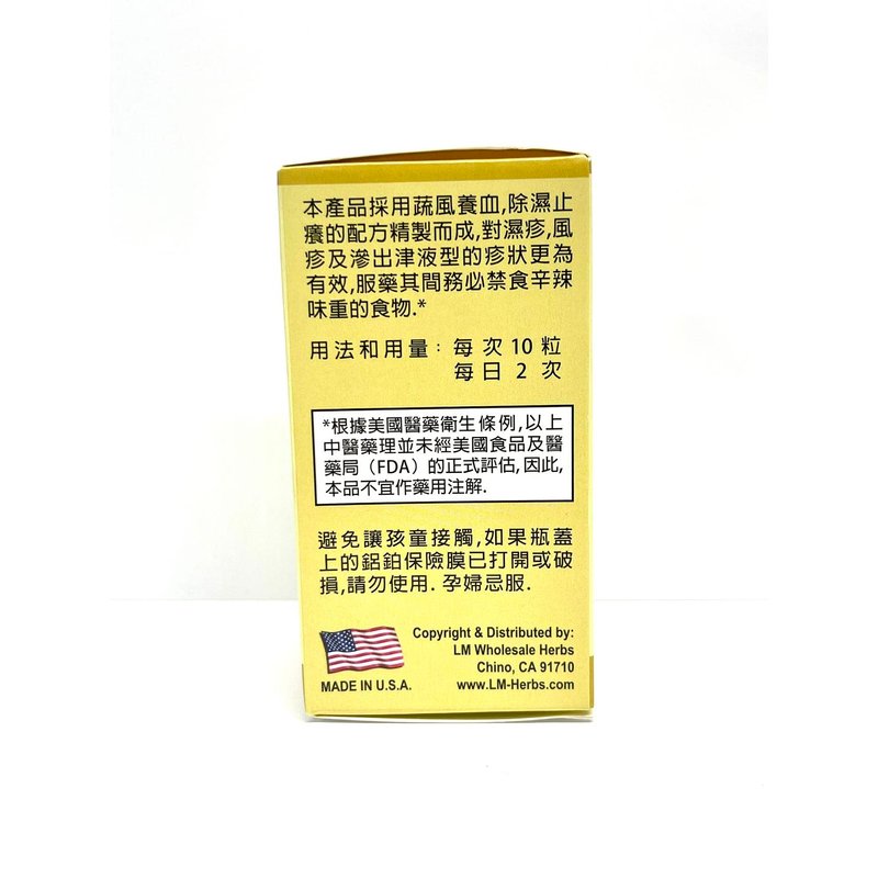 Ingredients: Rehmannia, Dong Quai, Sophora, Anemarrhena, Sesame, Siler, Black Atractylodes, Schizonepeta, Burdock, Licorice.