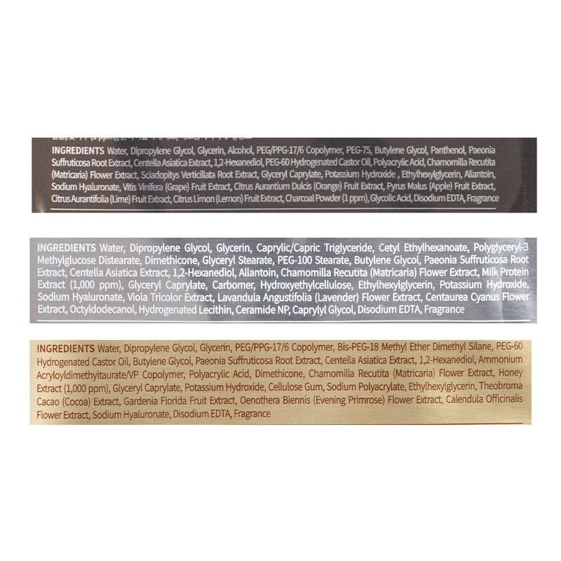 Pack Includes: 1pc Collagen Mask; 1pc Milk Mask; 1pc Honey Mask; 1pc Aqua Mask; 1pc Aloe Mask; 1pc Pearl Mask; 1pc Charcoal Mask; 1pc Charcoal Exfoliating & Cleansing Pad