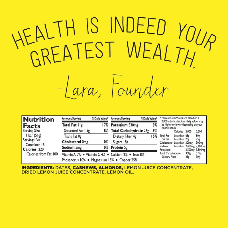 - REAL FRUIT: 6-ingredient whole food bar made from a simple blend of dates, cashews, almonds, lemon juice concentrate, dried lemon juice concentrate, natural lemon flavor
