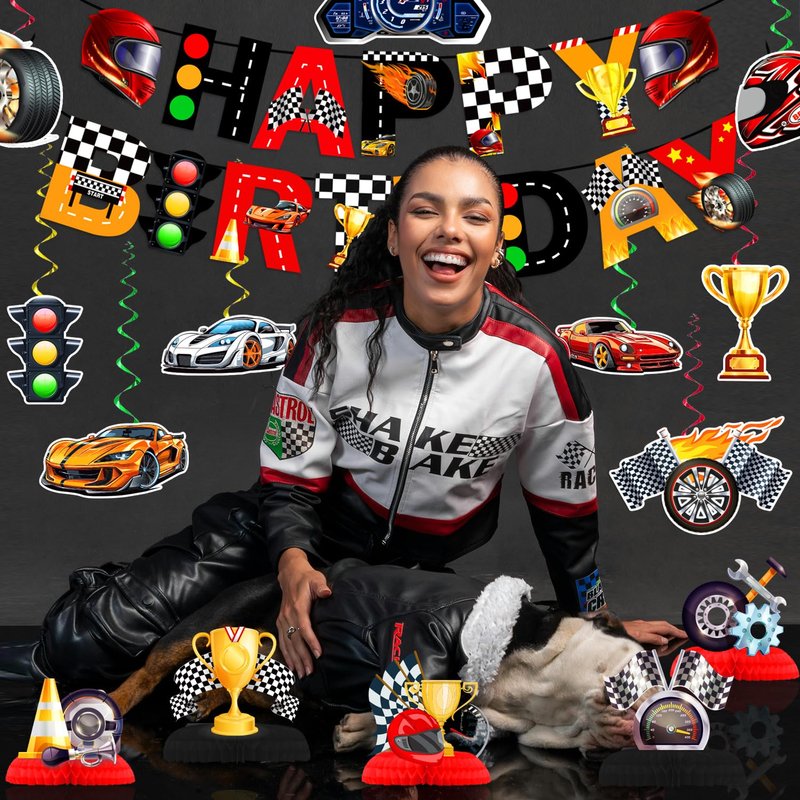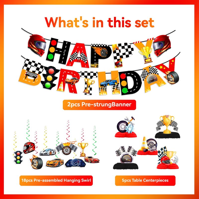 - 【RACE CAR DECORATIONS】You will get 1pc HAPPY BIRTHDAY banner, 9pcs race car hanging swirls and 5pcs race car honeycomb centerpieces. Just one set is enough to set up a perfect party for kids.
