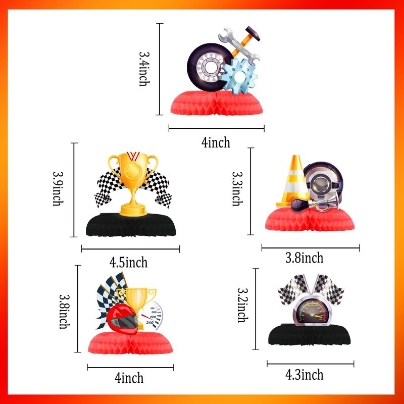 - 【EASY TO ASSEMBLE】The race car banners are pre-assembled. You can hang banners and foil swirls anywhere you like, such as on ceilings, windows, mantelpieces, doorways, arches, etc. And these race car honeycomb centerpieces are pre-cut, easy to assemble, and can be used as photo booth props, table decoration.