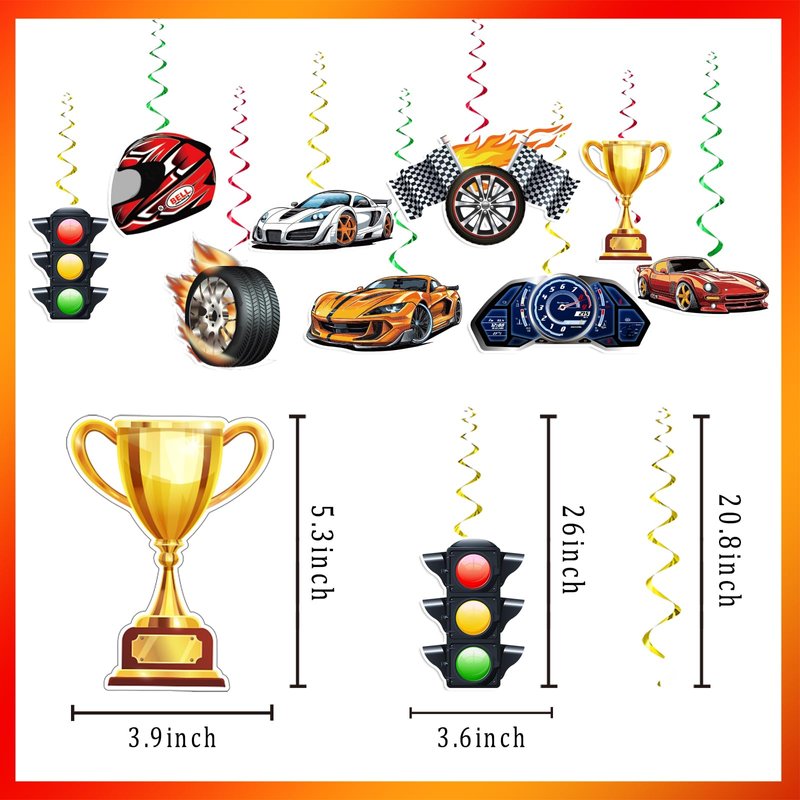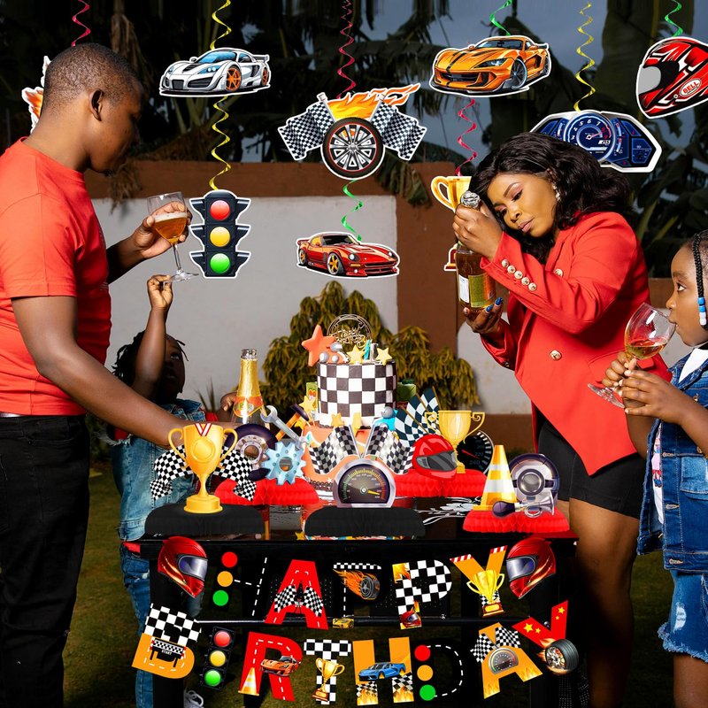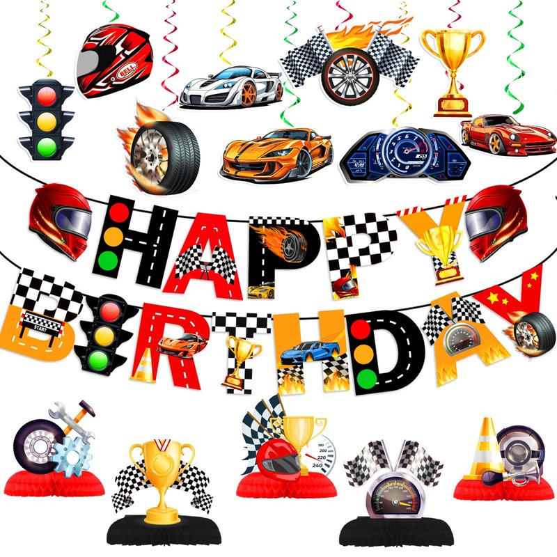 - 【PREMIUM QUALITY MATERIALS】These race car honeycomb centerpiece decorations and banners are made of quality-thick cardstock, which is more durable, and non-toxic. Race car theme foil hanging swirls are made of foil and paper material, cut perfectly.