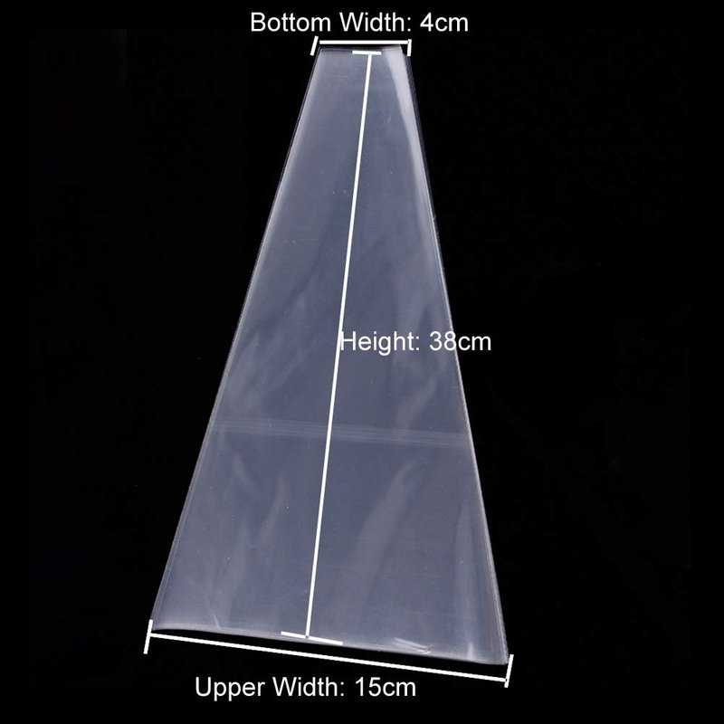 - Product name: Bouquet Sleeves; Height: 15" (38cm); Upper Width: 5.9" (15cm); Bottom Width: 1.57" (4cm); Color: Transparent