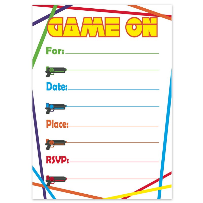 - Invitations have a colorful laser tag design on both sides of the invite.