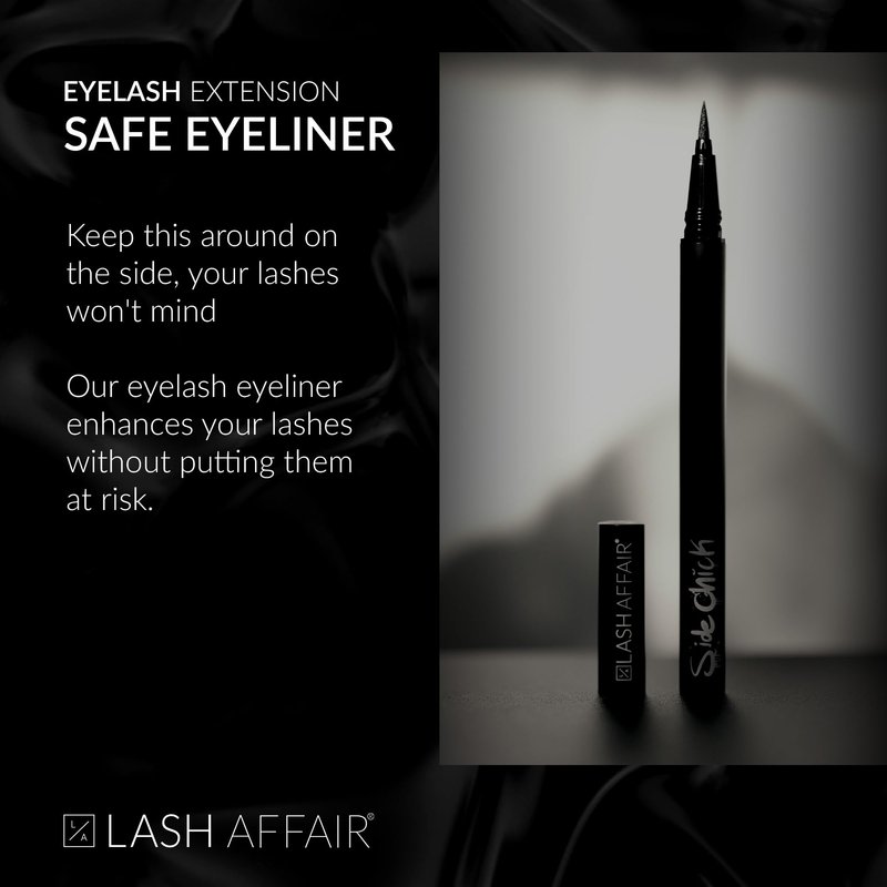 - EYELASH EXTENSION SAFE BLACK EYELINER PEN – Create unique makeup looks with our Side Chick liquid eyeliner pen. Safe for eyelash extensions, our felt eyeliner pen enhances your makeup look without putting your lashes at risk.
