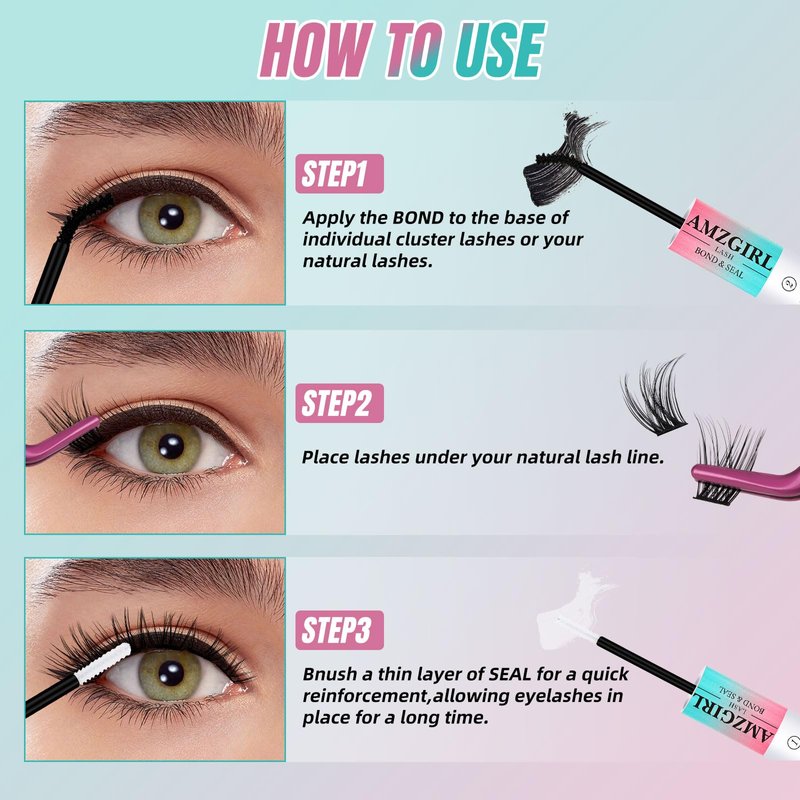 - 【BEST PARTNER FOR CLUSTER LASHES】2 in 1 eyelash extension bond and seal design, bond and seal lash glue can linger for up to 72 hours. The ingredients of lash bond glue are safe and gently. One side is bond, it has a tiny spiral brush head to help apply glue more evenly, and being as simple to use as mascara. The other side is lock, it helps form a protective layer after wearing plume individual lashes, locks beauty in your eyes and makes the lashes maintain a longer retention.