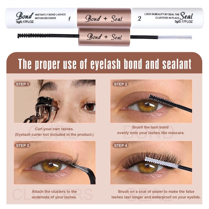 - 【Eyelash Glue & Seal Step-by-Step】First, curl your own lashes, after that first use lash glue (the black side) evenly on your lashes figure on the lash glue just like applying mascara. Wear the clusters as you see fit, and once you're done, apply seal to the false lashes (the end of the white brush head). Once the seal has dried, you can curl your lashes again with an eyelash curler.