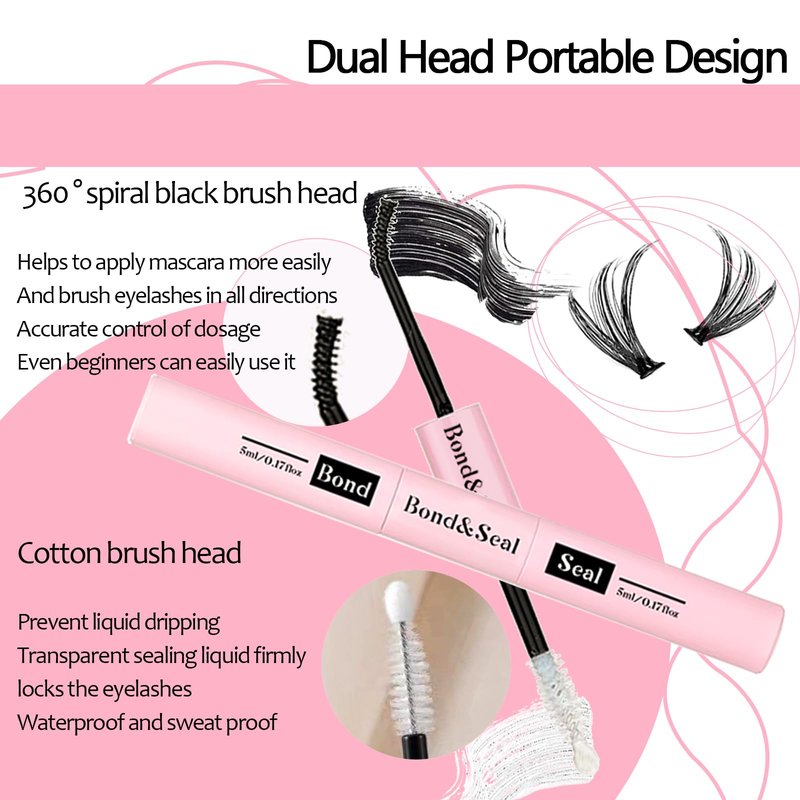 - 【2 in 1 Waterproof Lash Bond and Seal】Glue and sealed double tube design, the brush head uses 360 ° spiral mini eye black brush head to help more easily apply glue. The glue is black, the sealing liquid is transparent, and when paired with fake eyelashes, it looks more natural.