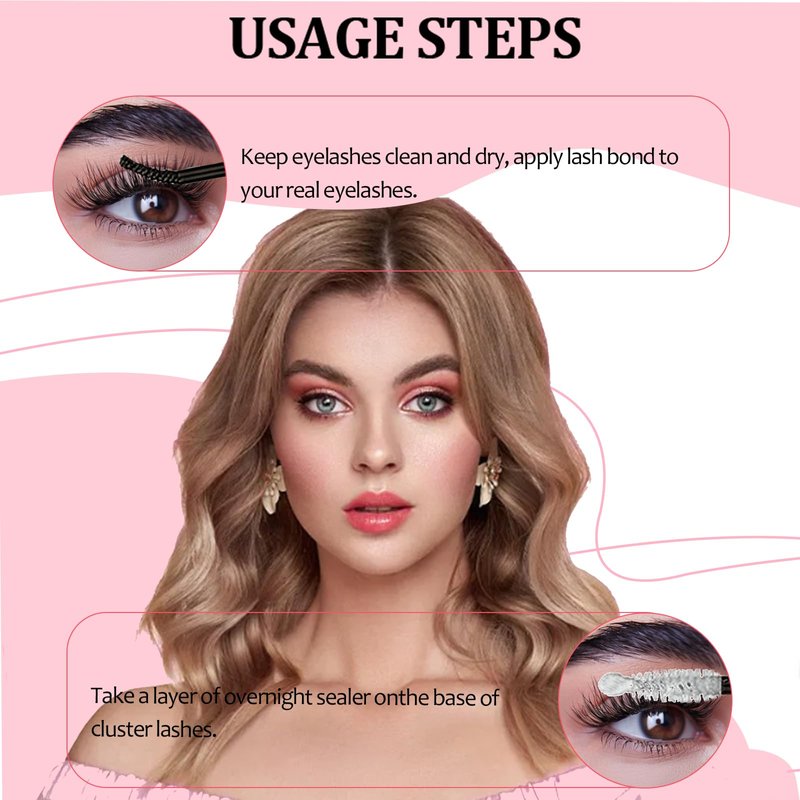 - 【Easy to Use】1:Clean the eyes and eyelashes before use. 2:Apply glue to the base of your own eyelashes using the bond end. 3:Take a single eyelash from the base of the eyelashes and apply it below them. Use tweezers or eyelash curlers to tighten the eyelashes. 4:Apply the seal end evenly.