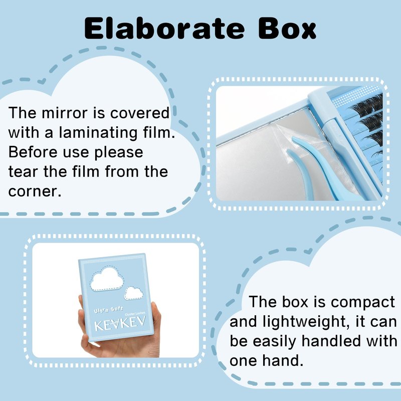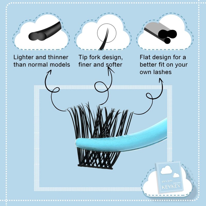 - Ultra Soft Lash Clusters: Experience the lightweight and thin design of KevKev ultra soft lash clusters. They are specifically crafted to be lighter and thinner than standard models, ensuring a comfortable and natural feel when worn.