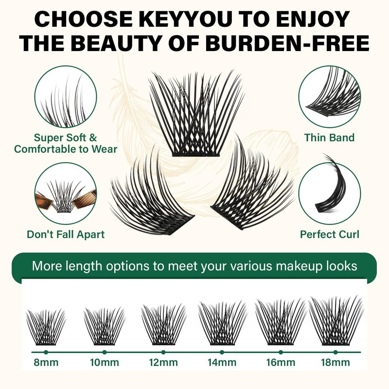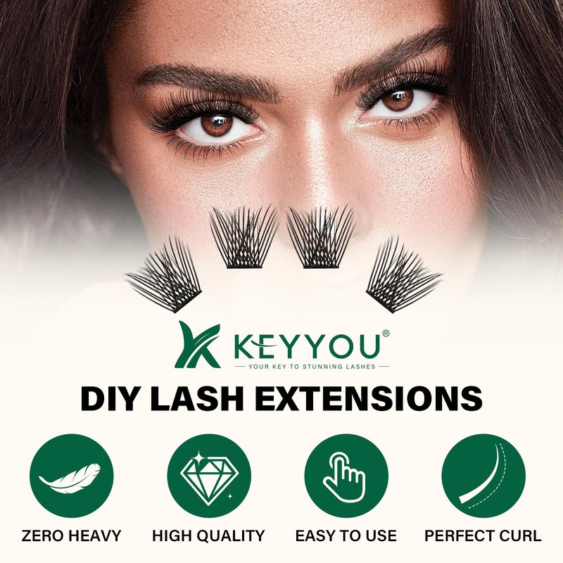 - HIGH QUALITY:KEYYOU lash clusters also made of high-grade fiber material.They have no plastic feel and very natural to wear,don‘t harm the eyes.