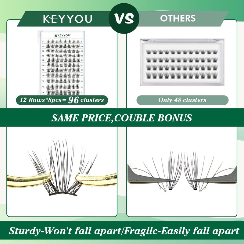 - 【Soft&Comfortable】KEYYOU lash cluster are made of imported materials,the stem line is thinner and softer, the eyelash cluster are lighter and more comfortable to wear.96 clusters in one tray ,more cost-effective.
