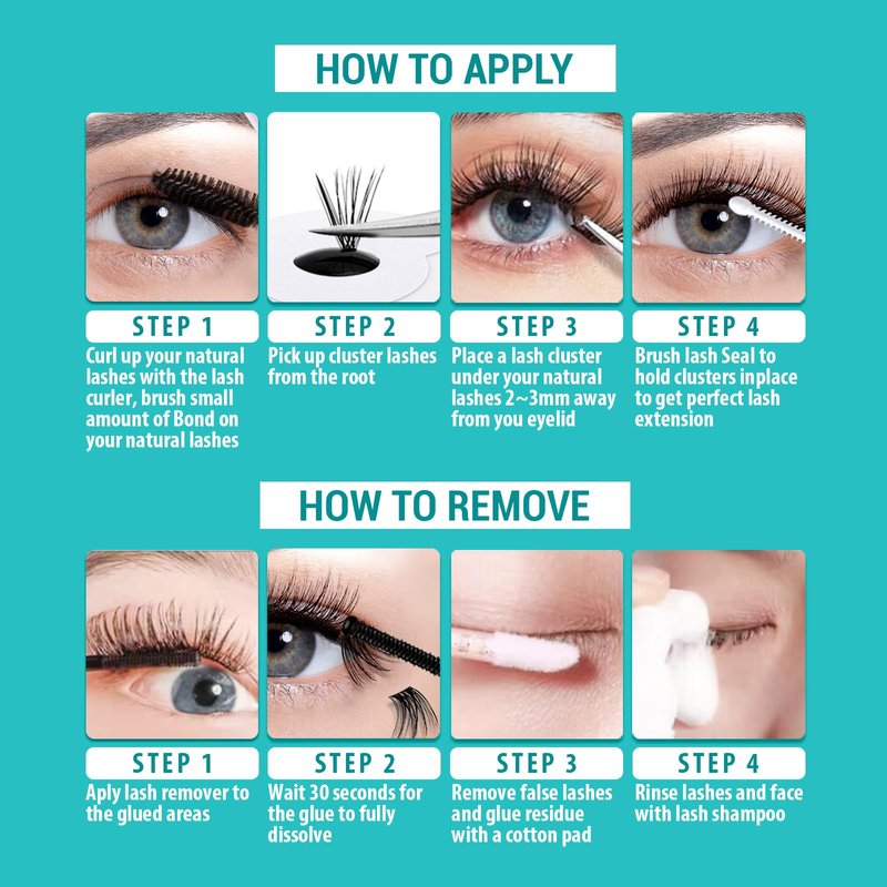 - Easier to Apply & Remove: This eyelash extension kit is very easy to use. The applicator this kit comes with good. It’s very easy to wear the lashes on and get the lashes off the lash strip. Curl up your natural lashes with the lash curler, brush small amount of bond on your natural lashes, pick up cluster lashes from the root, place under your natural lashes 2-3mm away from your eyelid. Brush lash seal to hold clusters in place to get perfect lash extension.