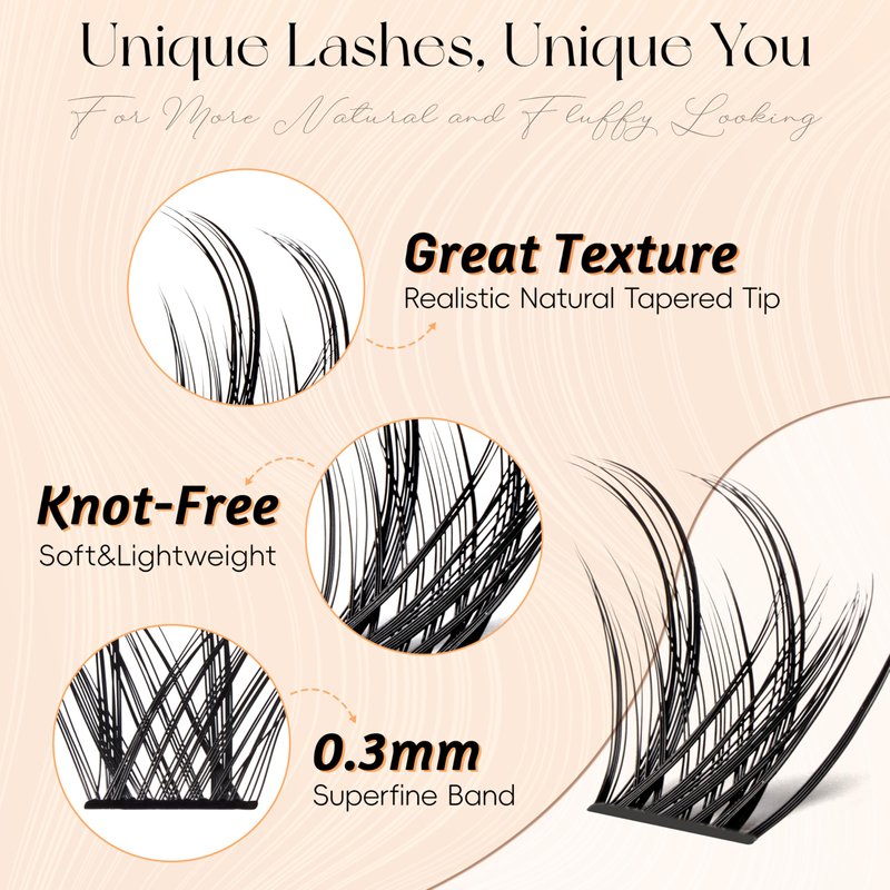 - PREMIUM QUALITY MATERIALS: VYRILA lash clusters are crafted from premium lightweight fibers that are unique in both appearance and feel. They are fluffy, and ultra-soft, blending seamlessly with your natural lashes. Our lash clusters are gentle on your lashes and won’t leave behind any sticky residue, ensuring an easy, smooth professional-quality experience, just like a salon visit
