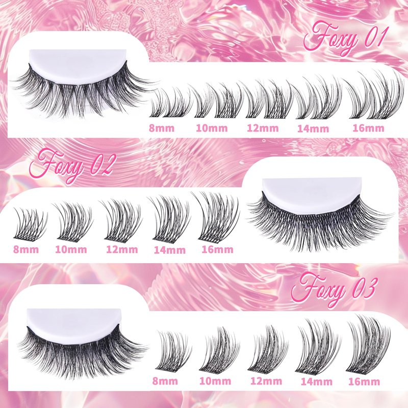 - Specifications: Most popular cluster lashes 30D 40D.Thickness 0.07 Curl D,mixed Length 9-16mm. Highly recommended foxy 01, fox eyes lashes with multiple effects of different lengths and diameters, upturned at the end of the eyes, elongating the eyes, showing sexy.New fashion trend is perfect to you who alway want to try new style