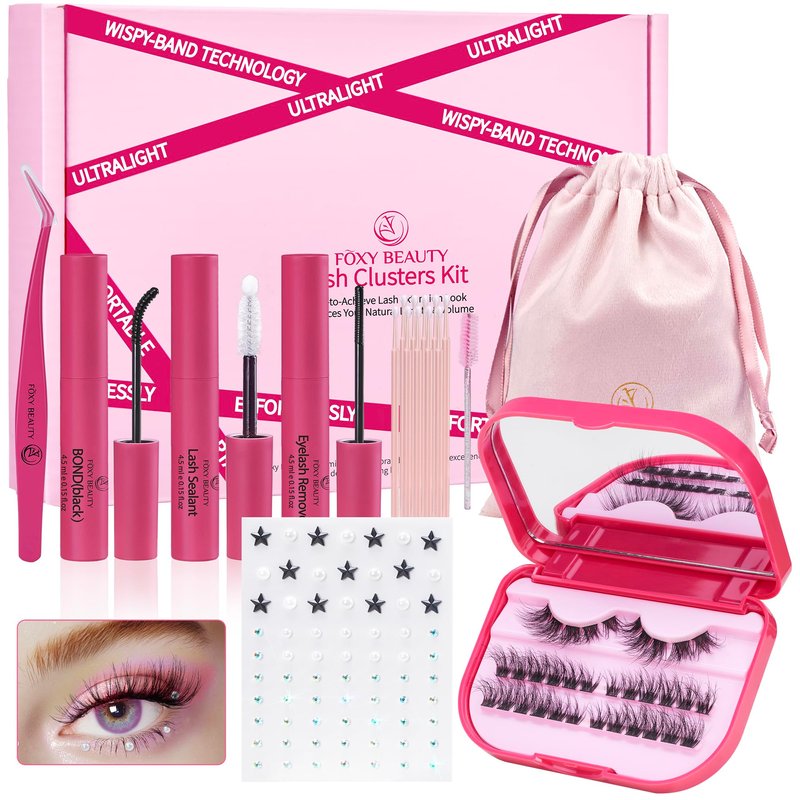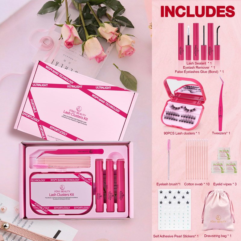 Lash Clusters Kit with Self Adhesive Pearl Stickers Fluffy Lash Clusters Left Right Lash Extension Kit with Bond Seal Eyelash Kit Gift Set with Drawstring Bag Portable Starter Kit Birthday Gift Women