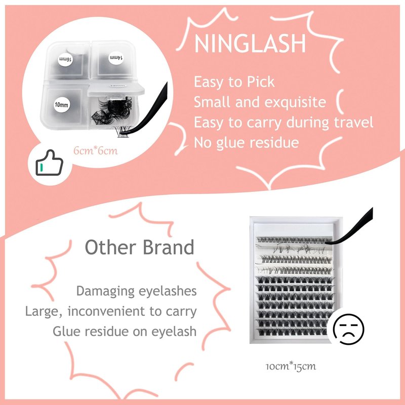 - 💞More Convenient To Take Eyelashes, better customer experience is the consistent pursuit of our brand: Clever box design. If you've used other brands of DIY lashes, you'll know that the lashes are broken when you remove them from the tape. Using NINGLASH DIY Eyelash Extension makes it easier to remove eyelashes without damaging them
