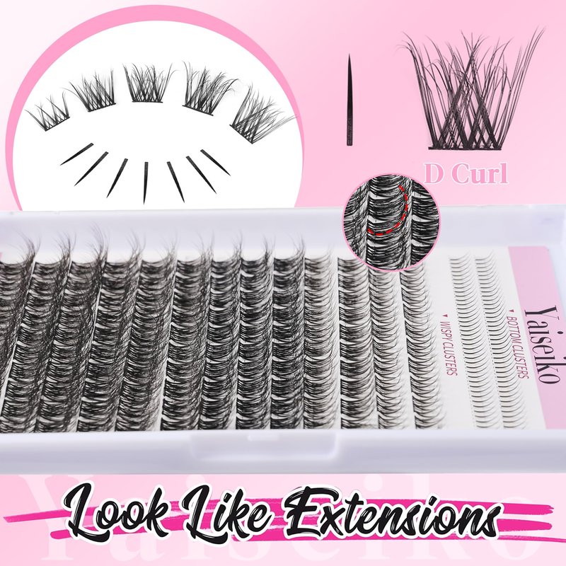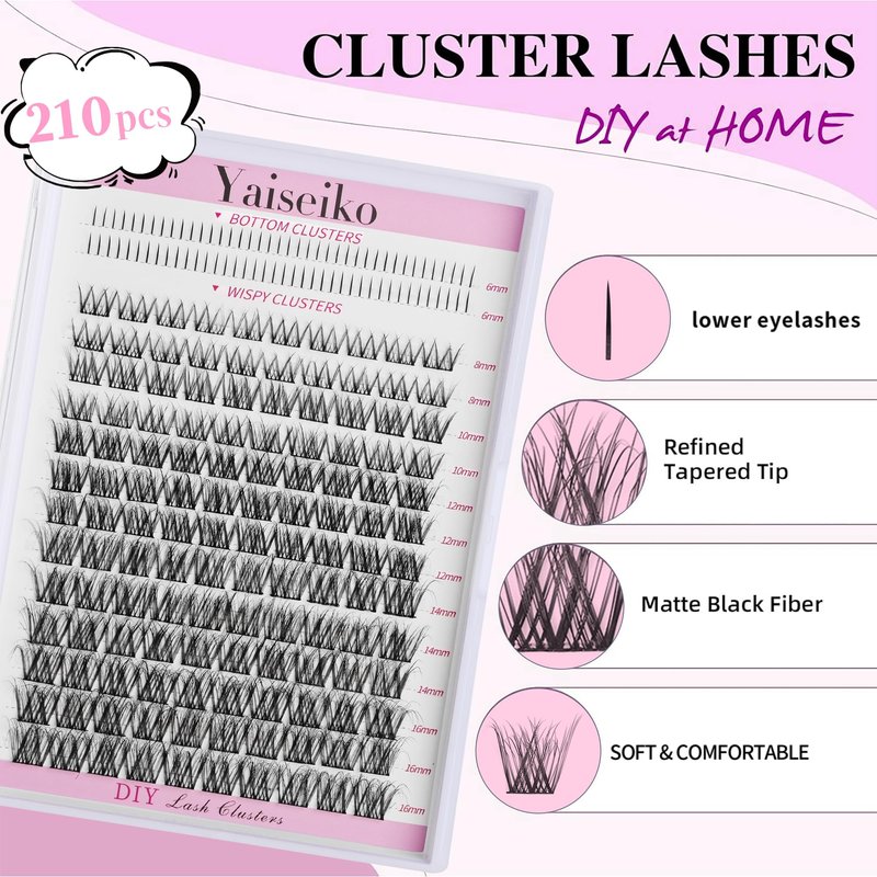 - 【Wispy Lash Clusters with Bottom Lashes】Yaiseiko cluster lashes contains 130Pcs 8-16mm wispy cluster eyelashes and 80Pcs 6mm bottom lash clusters. This combination helps create a more balanced and eye-catching appearance, contributing to a more expressive and charming eye makeup look.This style upgrade on the regular lashes clusters, more fluffy.