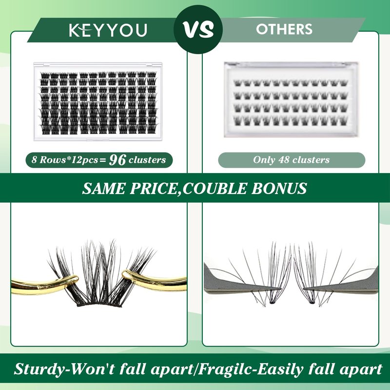 - 【Soft&Comfortable】KEYYOU lash cluster are made of imported materials,the stem line is thinner and softer, the eyelash cluster are lighter and more comfortable to wear.96 clusters in one tray ,more cost-effective.