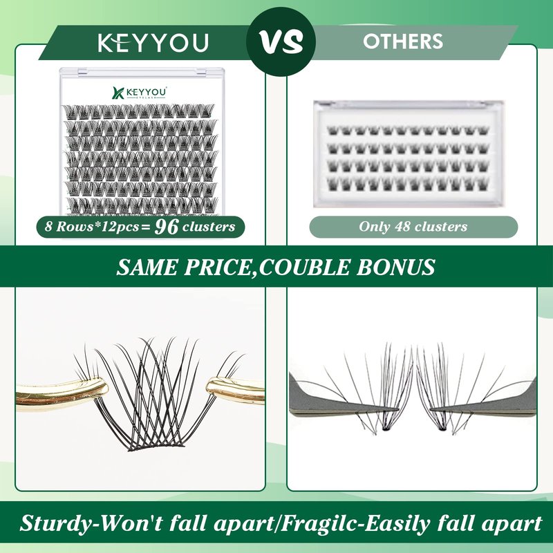 - 【Soft&Comfortable】KEYYOU lash cluster are made of imported materials,the stem line is thinner and softer, the eyelash cluster are lighter and more comfortable to wear.96 clusters in one tray ,more cost-effective.