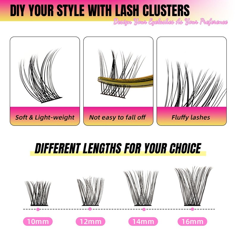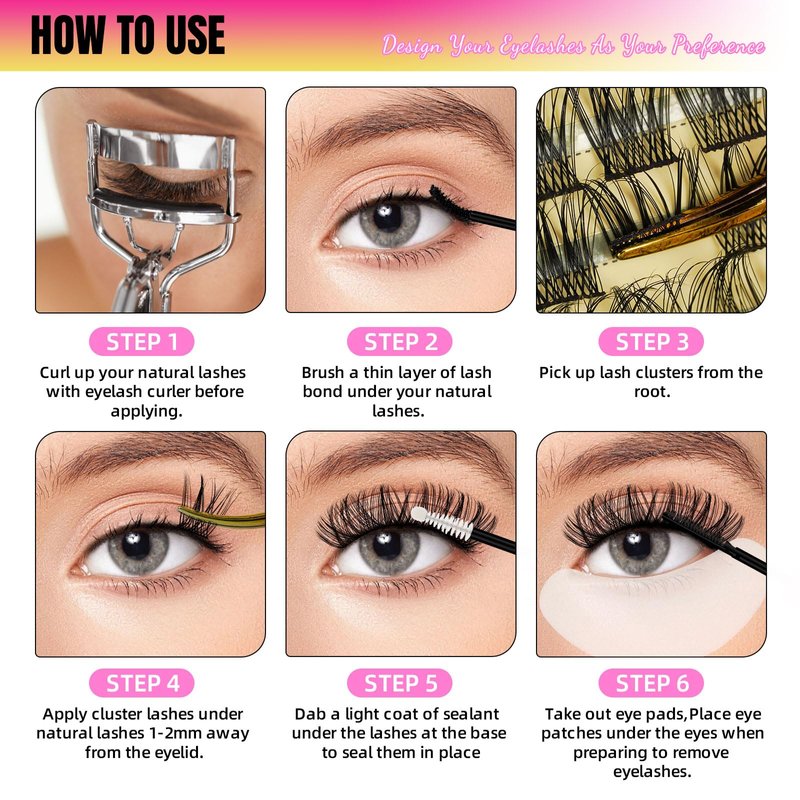 - 【Easy to Apply】An easy challenge! First, choose 4-5 individual lash clusters according to your own eye shape.Then, take off the false eyelashes by hand and apply 2-3 layers evenly to the lash stems with eyelash glue. Waiting for 10 seconds until the false eyelashes stick on steadily. Finally, wear the lashes to the lower or upper part of your natural cluster lashes. So you can finish your work!