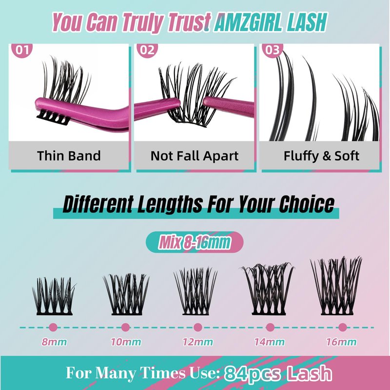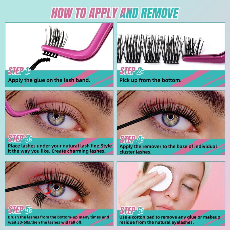- 【Easy Application & Easy Removal】The diy lashes kit is easy to apply.Apply a thin layer of bond to the root of your natural lashes,gently apply fake eyelashes beneath the natural lashes clusters with the lash applicator,then brush a thin coat of seal to lock false cluster lashes in place.Removal is also easy.Simply apply the remover to the root of individual eyelashes,brush the fake lash clusters,and finally use a cotton pad to remove makeup or glue residue.