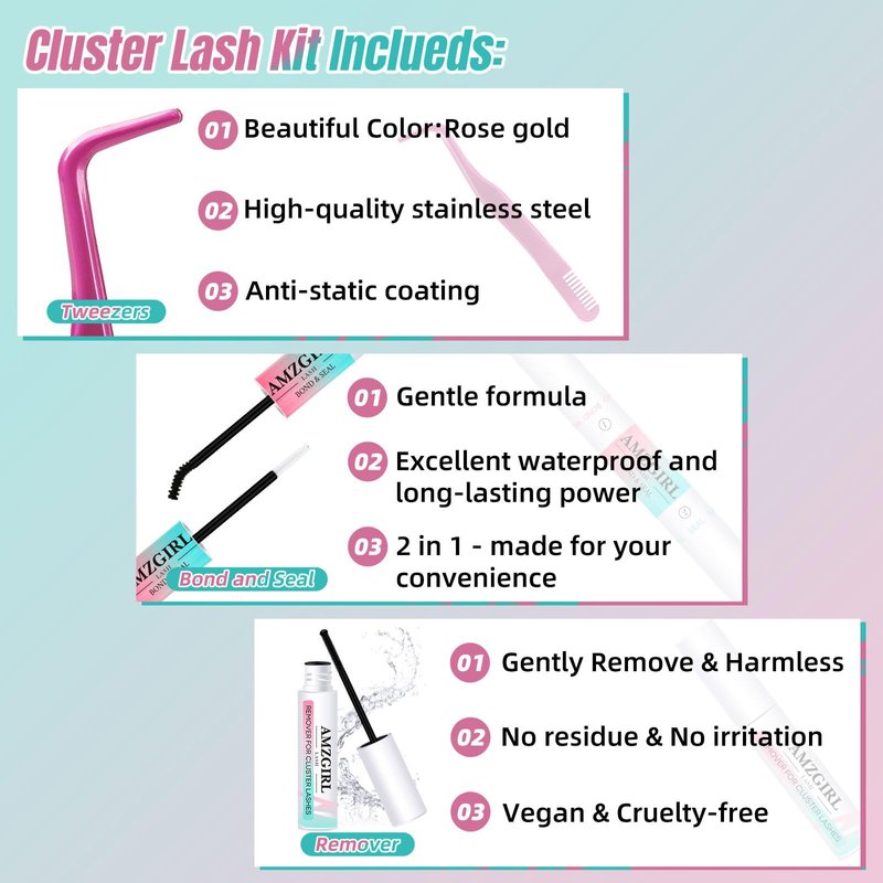 - 【Premium Cluster Lashes Applicator Tools】ALASH 2 in 1 eyelash extension bond and seal design in the lash kit for eyelash extensions beginners is waterproof and long lasting.The rose gold lash tweezers are designed with high-quality stainless steel and anti-static coating,and great grip make grab clusters lashes easier.