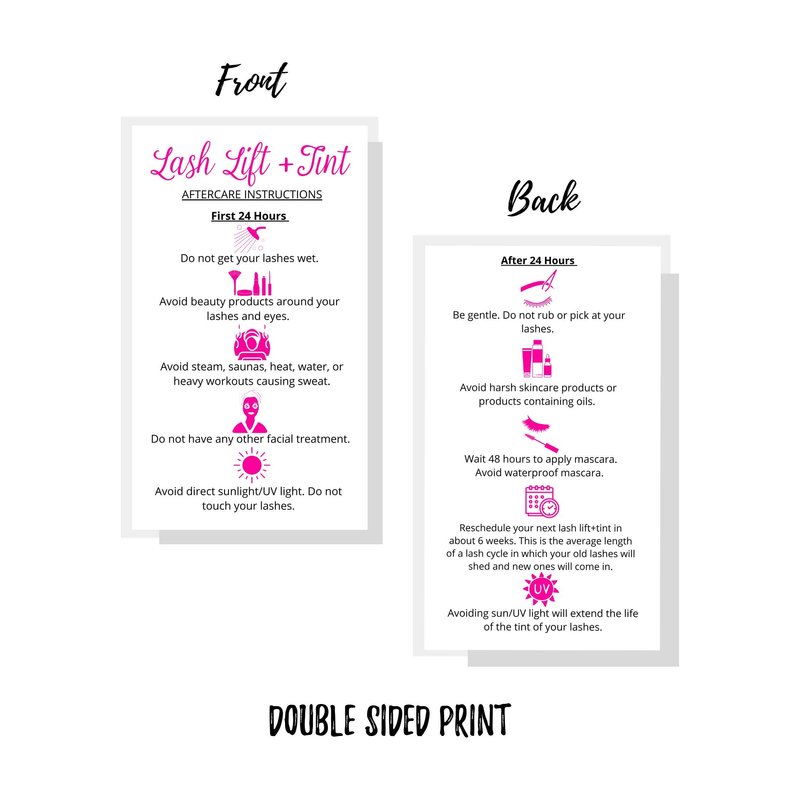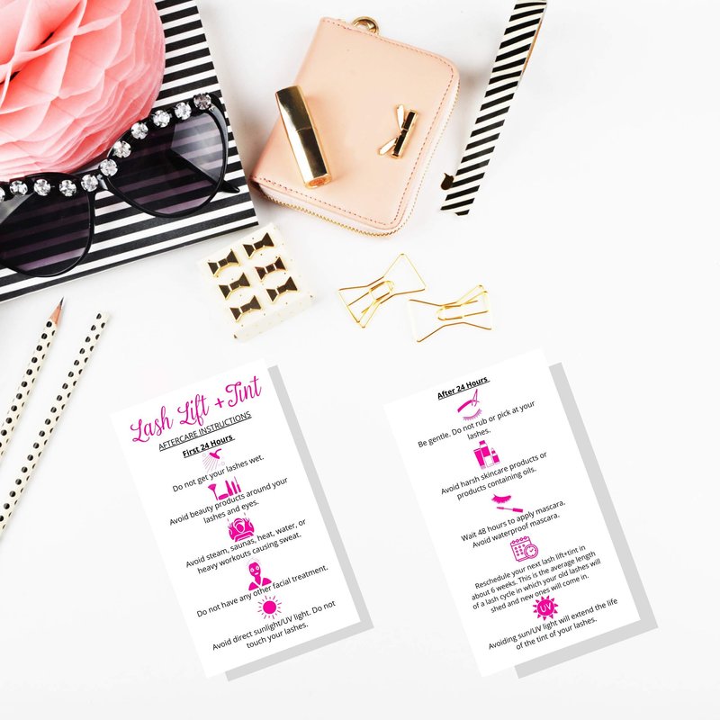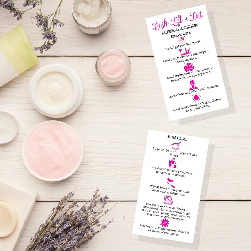 - Design is white with pink icons lash lift + tint aftercare instructions.