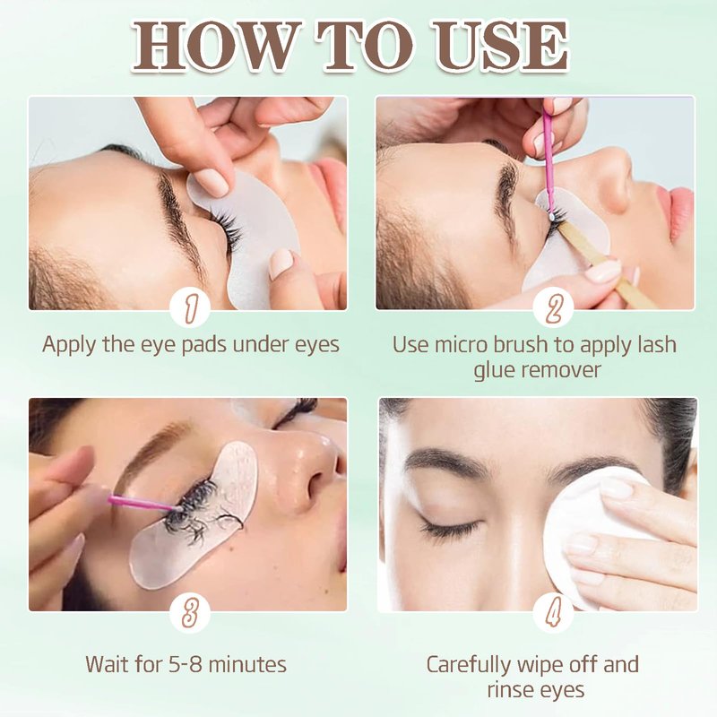 - 【How to Use】 First remove the patch from plastic liner and apply the eye pads under eyes, then use micro brush to apply some of lash glue remover to the lashes, wait 5-8 minutes and then carefully wipe off and rinse well to make sure there is no residue. If the adhesive is too thick to remove, please appropriately increase the remover’s amount and waiting time.