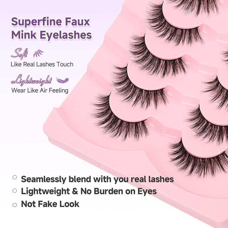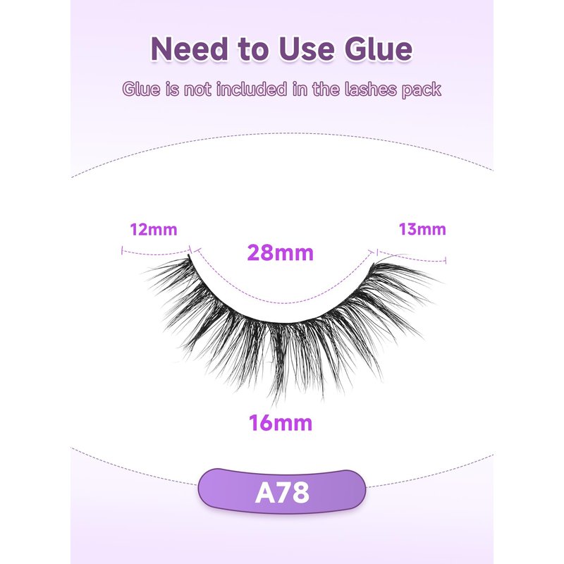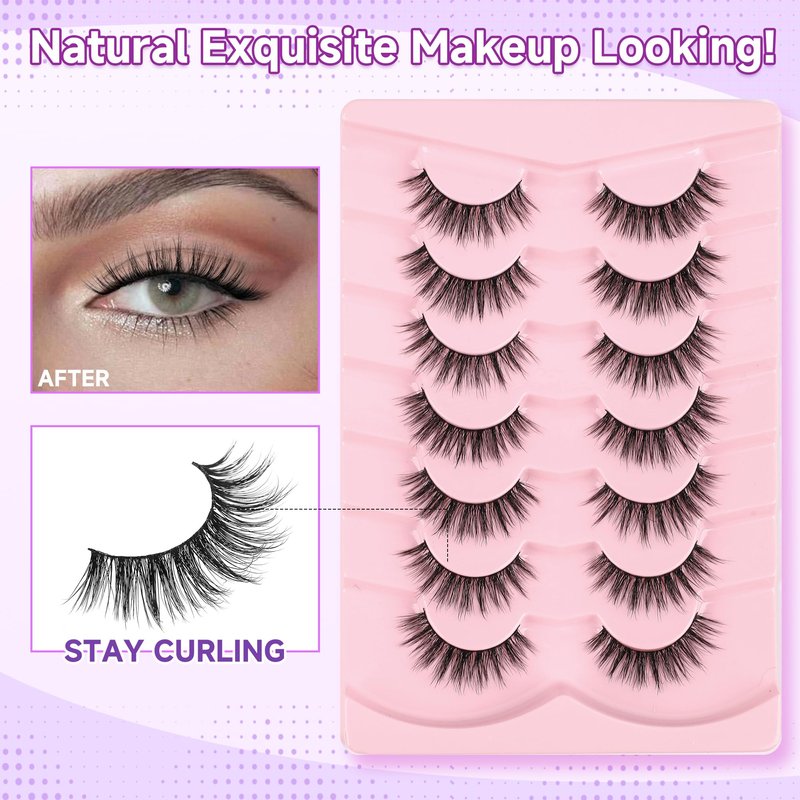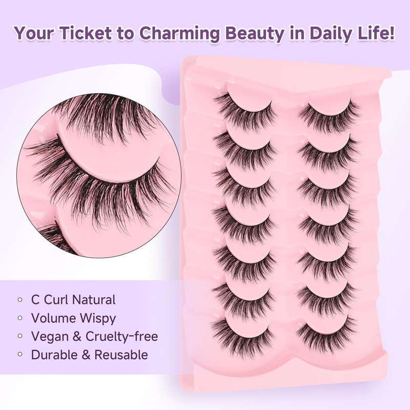 - VEGAN & REUSABLE: 7 pairs false eyelashes pack. The fake eyelashes use ultra-light synthetic fibers, cruelty-free, skin friendly. Bring pretty natural lash extensions look without damaging your own eyelashes, suit for DAY-TO-DAY use, wedding, vacation and so on