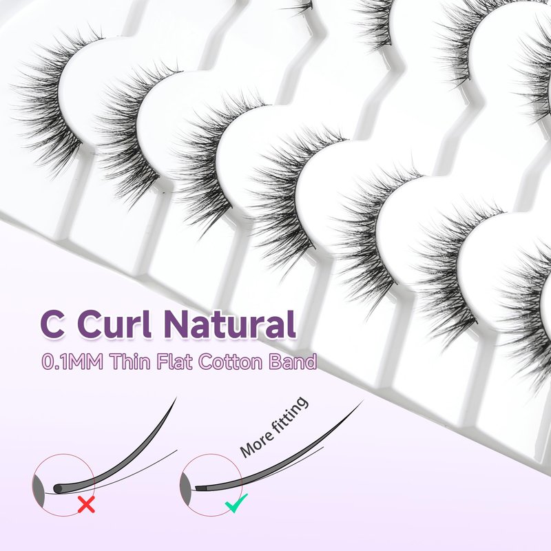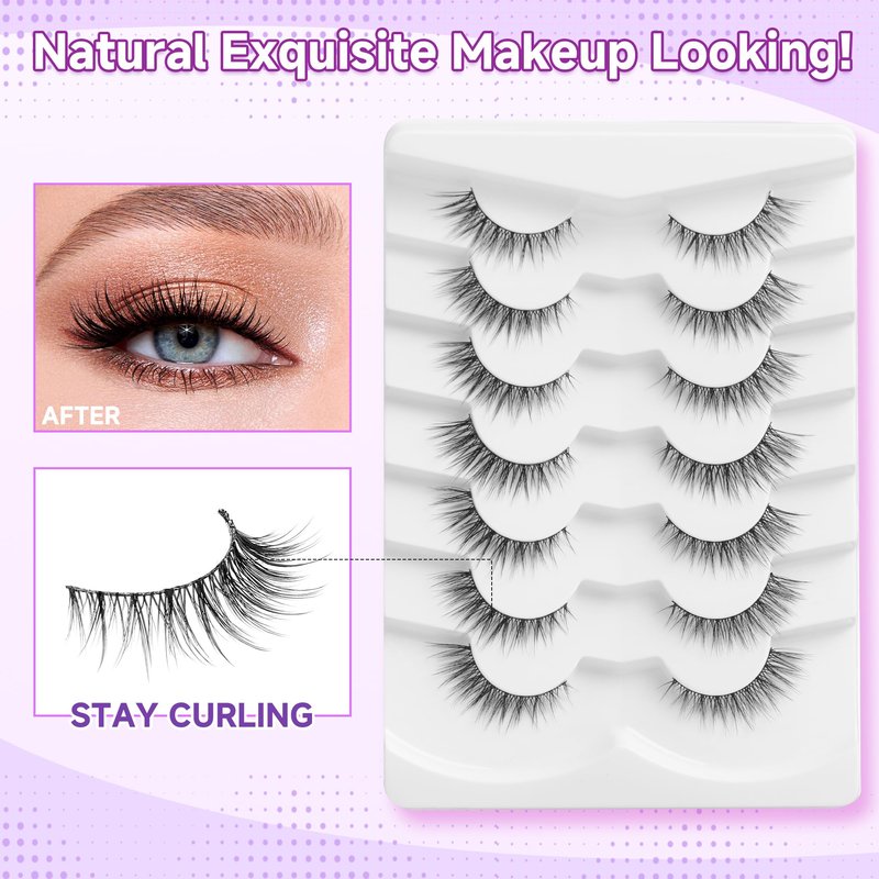 - VEGAN & REUSABLE: 7 pairs false eyelashes pack. The fake eyelashes use ultra-light synthetic fibers, cruelty-free, skin friendly. Bring pretty natural lash extensions look without damaging your own eyelashes, suit for DAY-TO-DAY use, wedding, vacation and so on