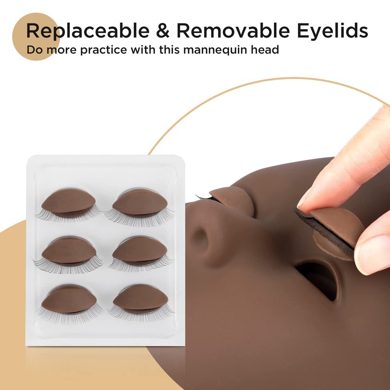 - 【PREMIUM QUALITY MATERIAL】 LASHVIEW lash mannequin head is made of high quality soft-touch silicone, and this lash extension mannequin head has three different skin colors and comes with 4 pairs of removable eyelids. It is more sanitary than a traditional mannequin head since the used eyelids may be replaced at any moment.