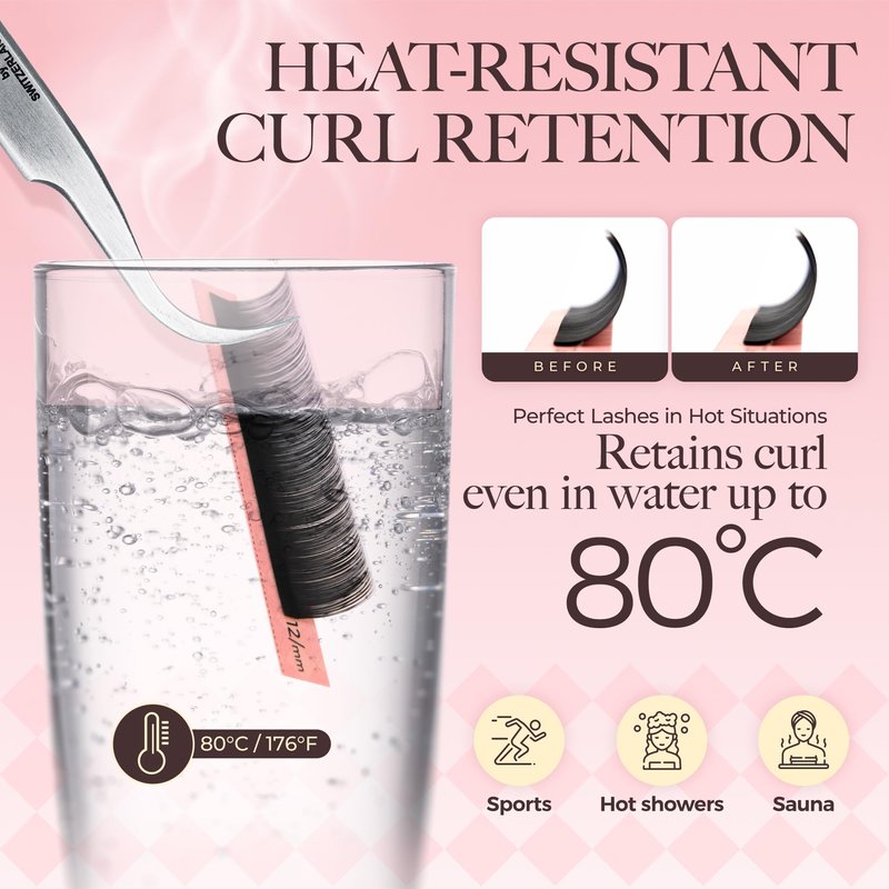 - Persistent Curvature & Heat-Resistant: This classic lash extensions product is made from special heat-resistant fibers, maintaining its curl even under high temperatures. It retains its shape even when soaked in 80°C water, making it ideal for hot showers, saunas, and other high-temperature environments.