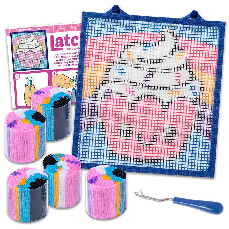 LatchKits Latch Hook Kit for Wall Hangings & Mini-Rugs - Cupcake - Craft Kit with Easy, Color-Coded Canvas, Pre-Cut Yarn & Latch Hook Tool - Perfect DIY Craft for Kids - Ages 6+