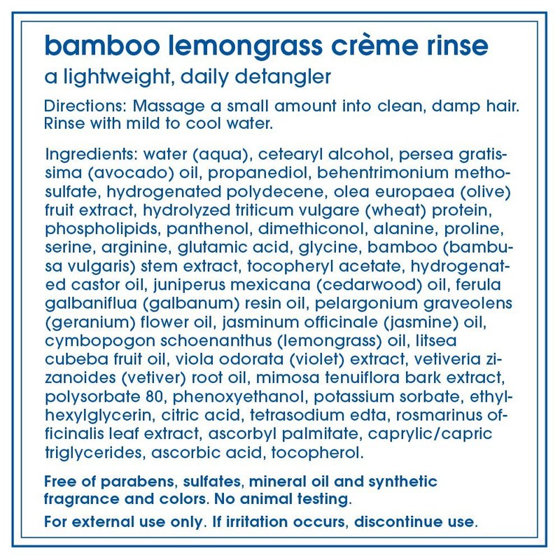 LATHER is a premium hair care set made with a combination of natural and organic ingredients. The shampoo gently cleanses the hair while protecting the scalp against dryness or discomfort. Its purifying properties also help reduce dry flakes. The conditioner hydrates the hair leaving it soft and shiny. This set contains bamboo extract, lemongrass essential oil and other natural extracts to nourish your hair without damaging it. Our Bamboo Lemongrass shampoo and conditioner can be used daily, suitable for all hair types. Both formulations feature bamboo extract, rich in silica and antioxidants to strengthen and protect hair. Aloe Vera is highly moisturizing to hair and scalp. Precious essential oils including lemongrass, geranium, jasmine and vetiver create a refreshing, invigorating aroma. Our Bamboo Lemongrass Hair Wash has wheat germ extract to protect with antioxidant Vitamin E, and comfrey, chamomile and rose extracts to soothe the scalp. Our Bamboo Lemongrass Crème Rinse includes avocado oil, rich in vitamin E and antioxidants, to promote shine, wheat protein and amino acids, to condition and strengthen hair, and panthenol, to hydrate and repair damaged hair. Shampoo - we love: the invigorating aroma of lemongrass essential oil. Conditioner - we love: avocado oil and olive fruit extracts help promote smooth and silky hair. No parabens, sulfates, mineral oil or synthetic fragrance and colors. Cruelty-free and made in the USA. No parabens, sulfates, mineral oil, synthetic fragrance, or colors. Vegan.