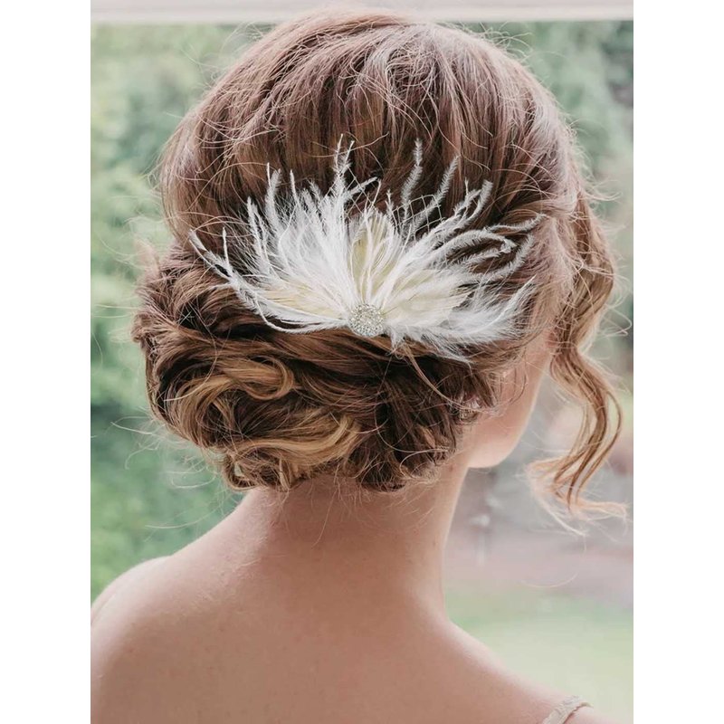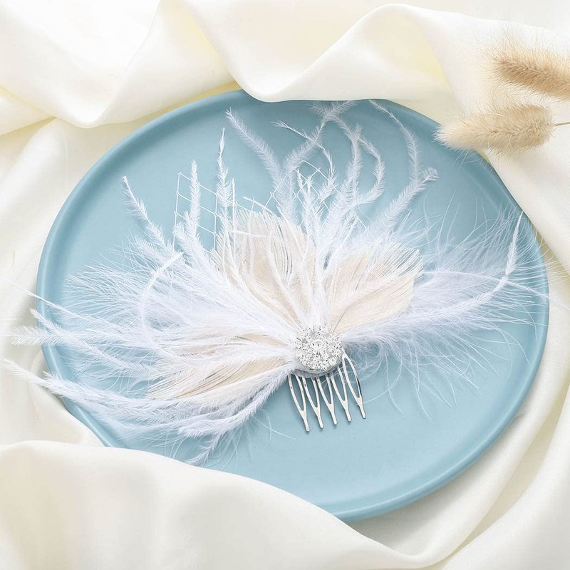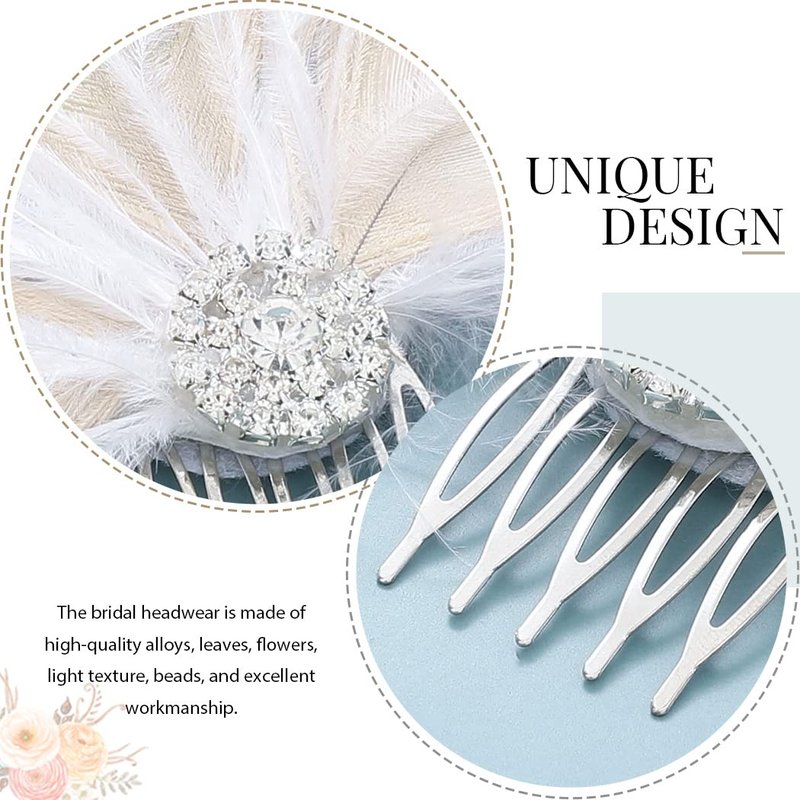 - Feather headpiece for women: Romantic pearl flower and floating rhinestones create a subtle, feminine accent for your bridal hairstyle.