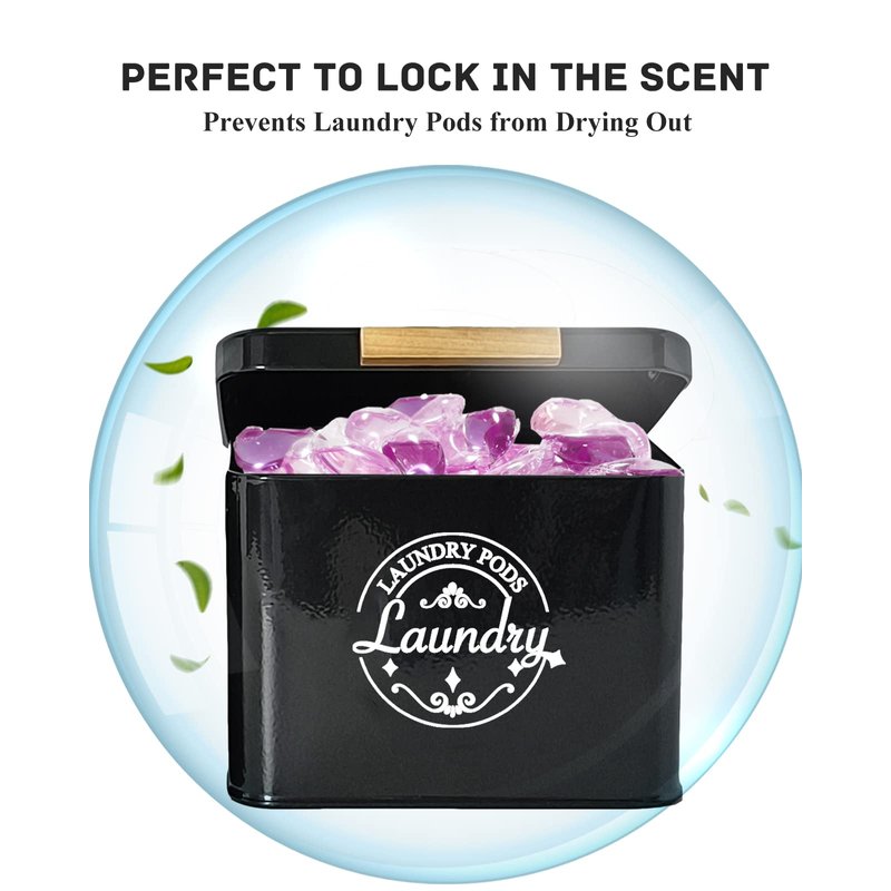 - LAUNDRY PODS CONTAINER WITH HINGED LID: Still struggling to find the cover everywhere? The laundry pods storage with hinge solves these for you. Our laundry storage with a high-quality hinged lid is easy to open and fill. It also features a wooden handle lid to keep your laundry soap pods fresh and tidy. It will also help preventing laundry pods from drying out too quickly.