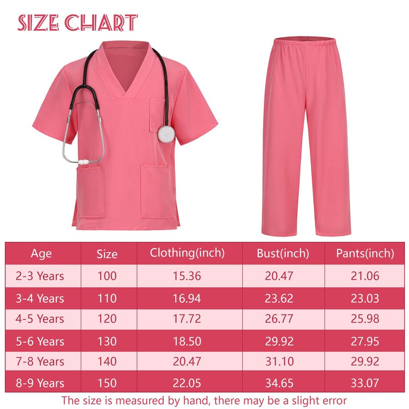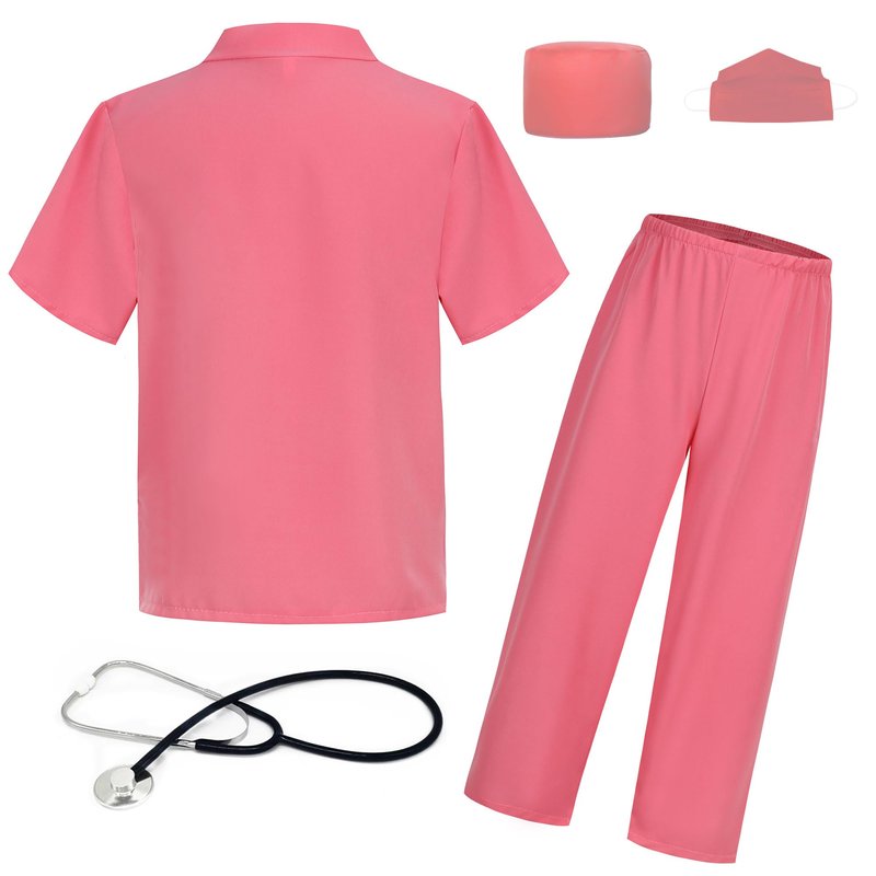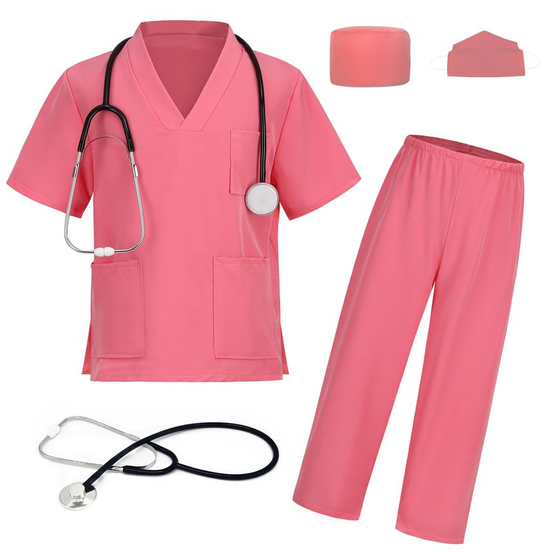 - 5-Piece Costume Set: scrubs for kids includes a top, pants, hat, surgical mask and stethoscope prop.The perfect dress up for a doctor.
