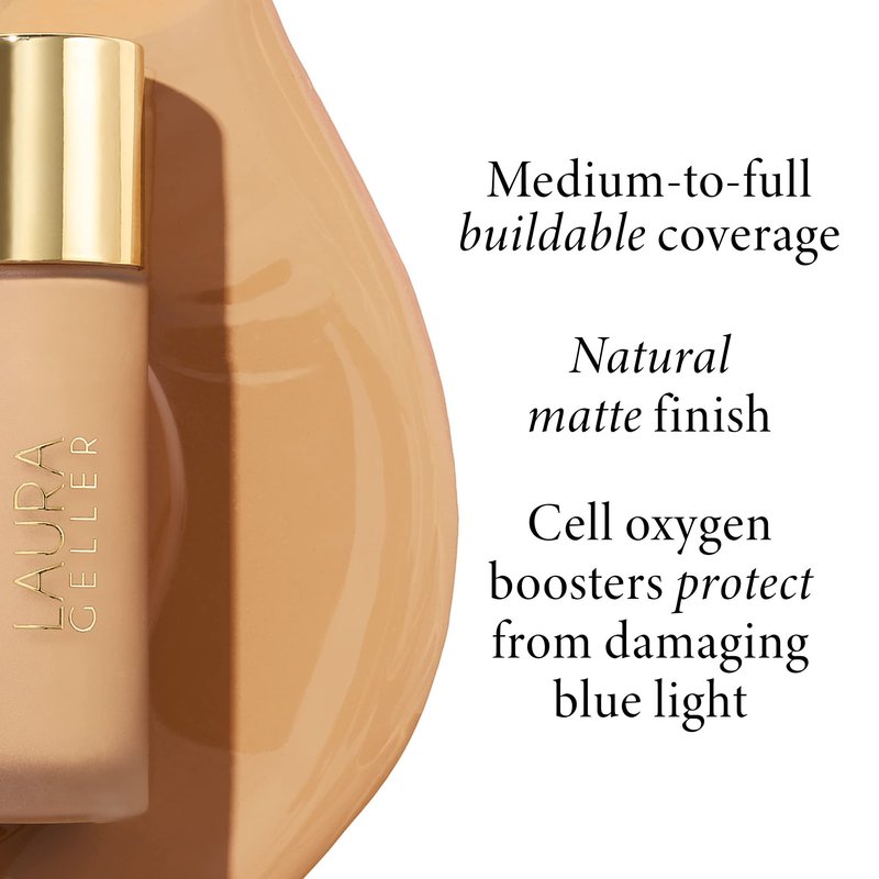 Enjoy our long-wearing, breathable, buildable coverage that lasts with Laura Geller’s innovative Double Take Liquid Foundation! This medium to full coverage foundation formula works to cover, conceal, blur and perfect without settling into fine lines or wrinkles. It offers a natural matte foundation finish that pairs so well with any Laura Geller baked foundation formulas. Use it with our iconic Double Take Baked Full Coverage powder foundation for the ultimate coverage!