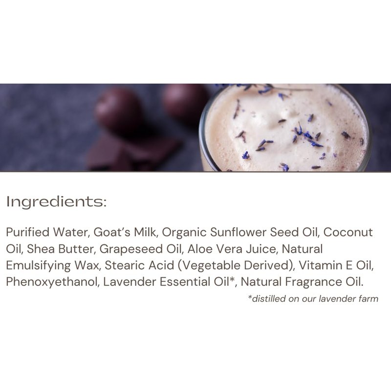 Elevate your skincare routine with our lavender farm's nourishing Lavender Latte Hand & Body Lotion, a decadent blend crafted from the finest ingredients nature has to offer. Enriched with the creamy goodness of goat's milk, the nourishing properties of sunflower oil, the luxurious feel of shea butter, and the rich hydration of coconut oil, this lotion is a sensory delight. Immerse yourself in the invigorating essence of lavender and sweet latte as your skin absorbs the rich, moisturizing goodness, leaving you with a velvety softness that lasts. Embrace the luxury of nature's touch with our Lavender Latte Hand & Body Lotion – a symphony of botanical bliss for your skin.