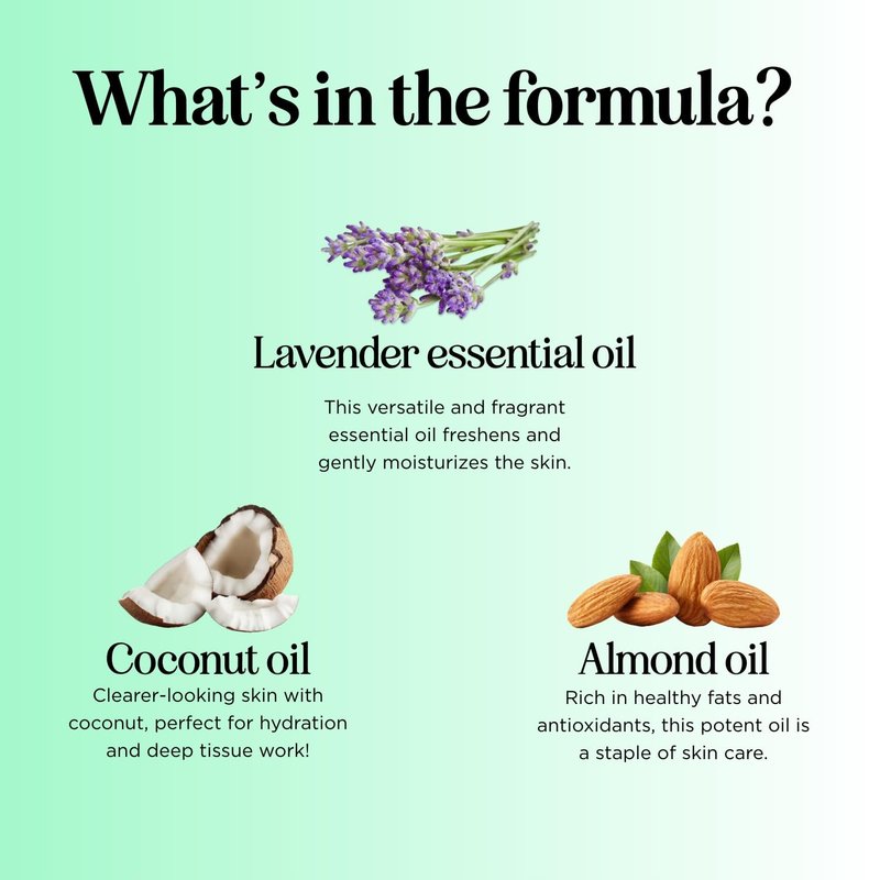 - Real Ingredients - Leave artificial additives behind and choose a product packed with natural oils like our sweet almond oil coconut oil and lavender essential oil formula for a massage you will love