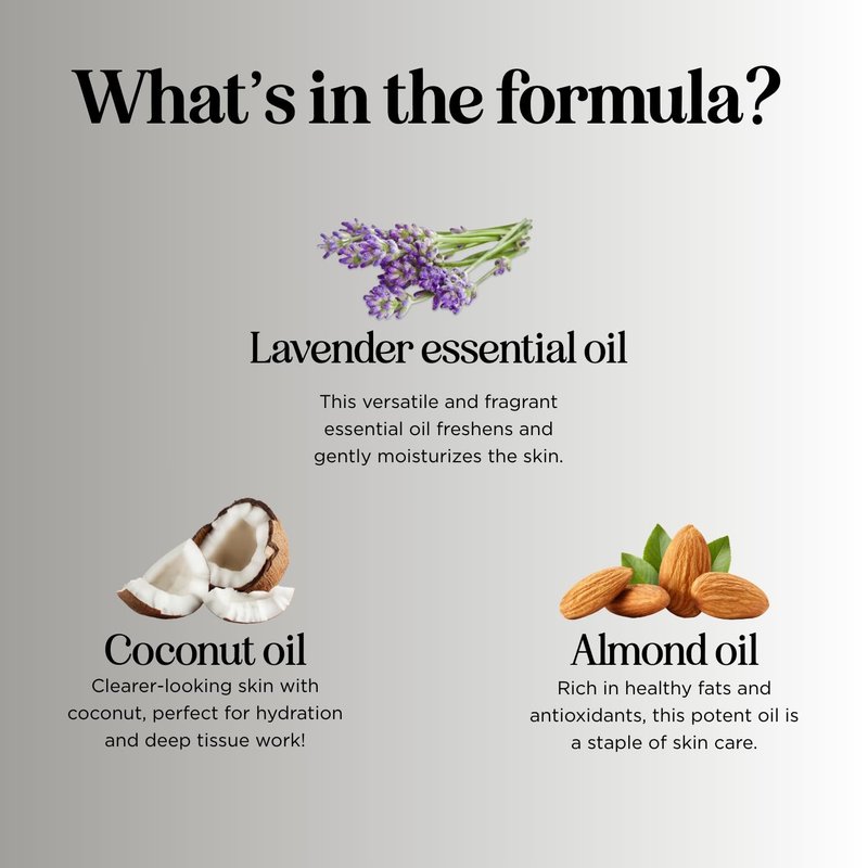 - Multipurpose Massaging Oil - Sit back and relax with our sore muscle oil massage made with super moisturizing sweet almond oil and lavender essential oil carefully crafted to relax the mind and body