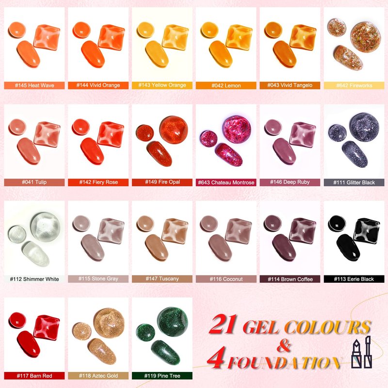 - Gel Nail Polish Comprehensive Kit: Lavender Violets Upgraded all-inclusive 21+4+2 Gel Nail Polish Kit, includes 21 Perfect Colors Gel, 1x Blooming Top Coat, 1x Matte Top Coat, 1x Glossy Top Coat, 1x Base Coat and 1x Gel Liner Brush.