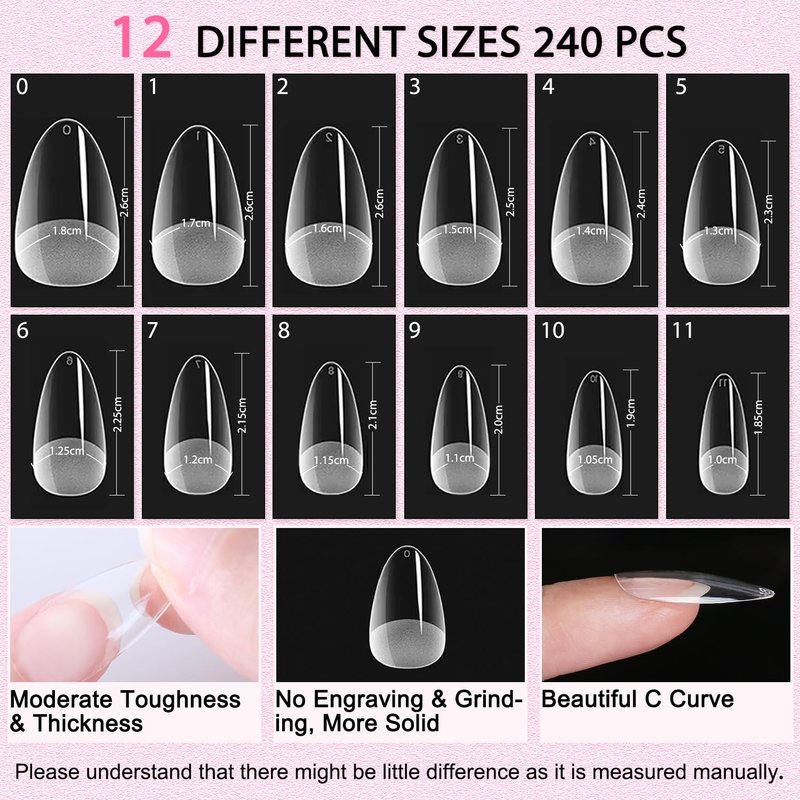 - Premium Quality Nail Tips: Lavender Violets gel nail polish set includes 240 short almond nail tips made from high-quality PMMA material. These lightweight and durable tips provide a natural look and feel. Each nail extension set is numbered 0-11 for easy size selection, ensuring a perfect fit for every finger.