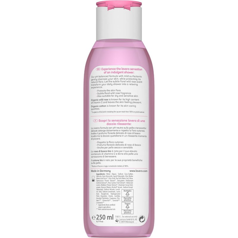 The pH-balanced formula of our Indulgent Body Wash with mild surfactants gently cleanses the skin, while protecting its natural flora. Feel the gentle power of nature on your skin, and let the enticing natural and subtle floral Wild Rose fragrances and delicate lather transform your indulgent shower into a relaxing experience. Suitable for dry and sensitive skin. Contains Organic Wild Rose is known for their high content of vitamin C, a strengthening and revitalizing effect, and that leaves the skin feeling pleasant velvet and offers some valuable benefits for daily skin care. With Organic Cotton is known for nourishing qualities, protects, pampers dry and irritated skin, leaving it soothed and protected, supports gentle cleansing of the skin, and soothing and regenerating properties of this gentle organic plant extract benefit both normal and sensitive skin, combined with other ingredients, it leaves the skin feeling silky smooth. Biologically degradable formulas, silicone-free, without mineral oils or artificial fragrances, colours, or preservatives.Certification according to the rigorous independent NATRUE natural cosmetics standard. Dermatologically tested. The plastic of this bottle incl. the cap is made from 100% recycled material. PETA is certified and committed to animal welfare. Lavera Naturkosmetik has developed nourishing recipes for the Body Care collection that provides your skin with intensive moisture using exclusive active ingredients protect your skin from drying out. We manufacture our own products organic plant and organic extracts and combine them with innovative active ingredients. Every skin type has its own special care needs. If you value natural ingredients and products that are mild on your skin, Lavera Naturkosmetik is the right choice for you.