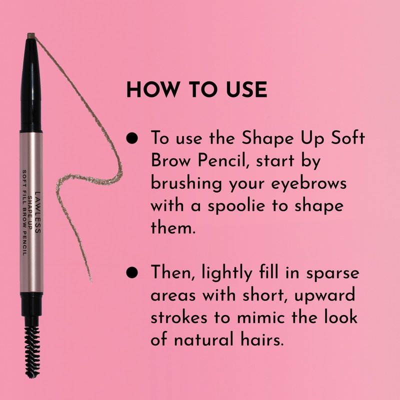 - How to Use: Start by brushing your eyebrows with the included spoolie to shape them. Then, lightly fill in sparse areas with short, upward strokes using the Shape Up Soft Brow Pencil to mimic the appearance of natural hairs. Blend using the spoolie for a seamless finish.