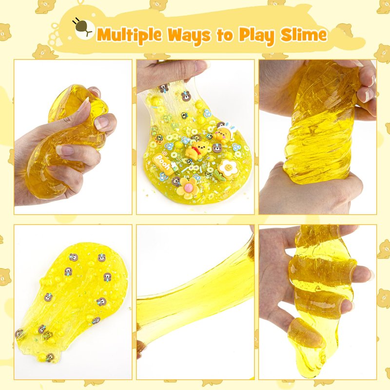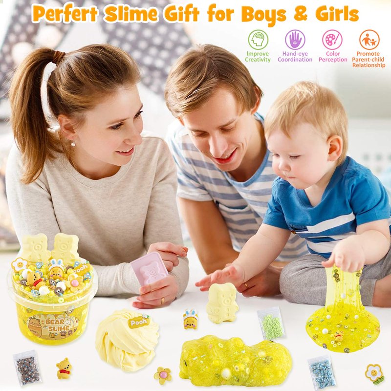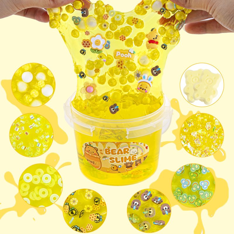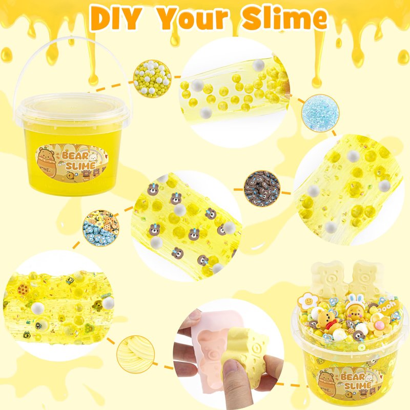 • 【Bear Slime Kit】Our kids slime kit includes 300ml yellow clear slime and 8 packs slime add-ins and 5 cute bear slime charms. Create your own unique slime creations with this clear slime set featuring a bear with a variety of adorable slime charms and rich soft ceramic pieces.