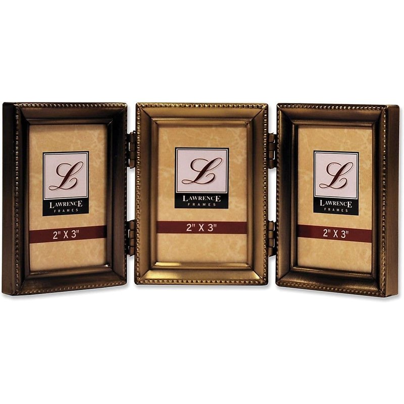 Lawrence 11423T Antique Gold Brass Hinged Triple 2x3 Picture Frame-Beaded Edge Design