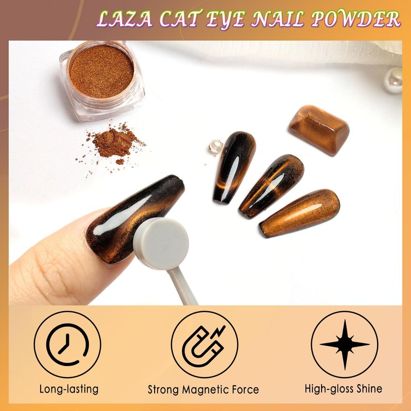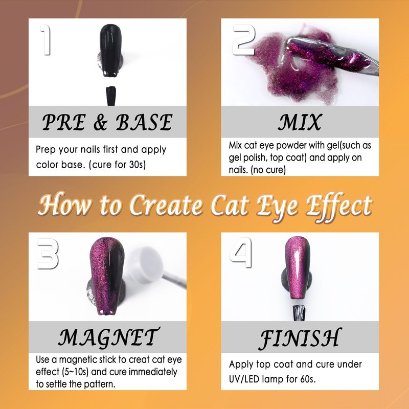 - Cat Eye Nail Powder: Compared with ordinary cat eye effect powder, our cat eye powder is finer and more shining, mixed with strong magnet powder, you can create many different patterns easily. You can also see color changing effect from different angles, and shine like a galaxy to make you unique.